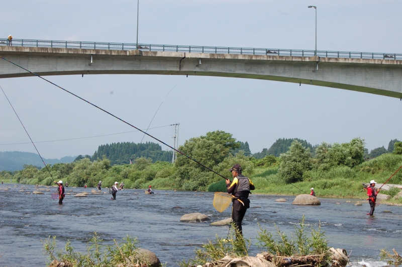 最上小国川は鮎が有名。年間8回も、国内一流つりメーカーの友アユ釣りのトーナメント(大会)が行われています。